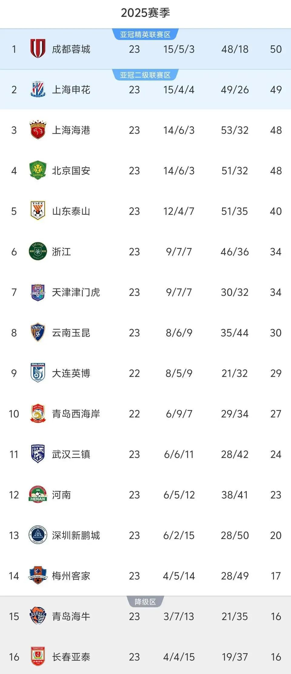 成都蓉城积50分坐稳本轮榜首宝座,申花凭借差1分屈居第二,北京国安大败之后,净胜球劣势明显,与上海海港同积48分,但让出第3名,排在第4位。