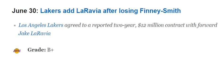 北京时间7月1日,湖人与23岁射手杰克-拉拉维亚达成一笔2年1200万美元的签约协议。ESPN随后对湖人这笔签约给出评级:B+。数据专家Kevin Pelton点评如下——